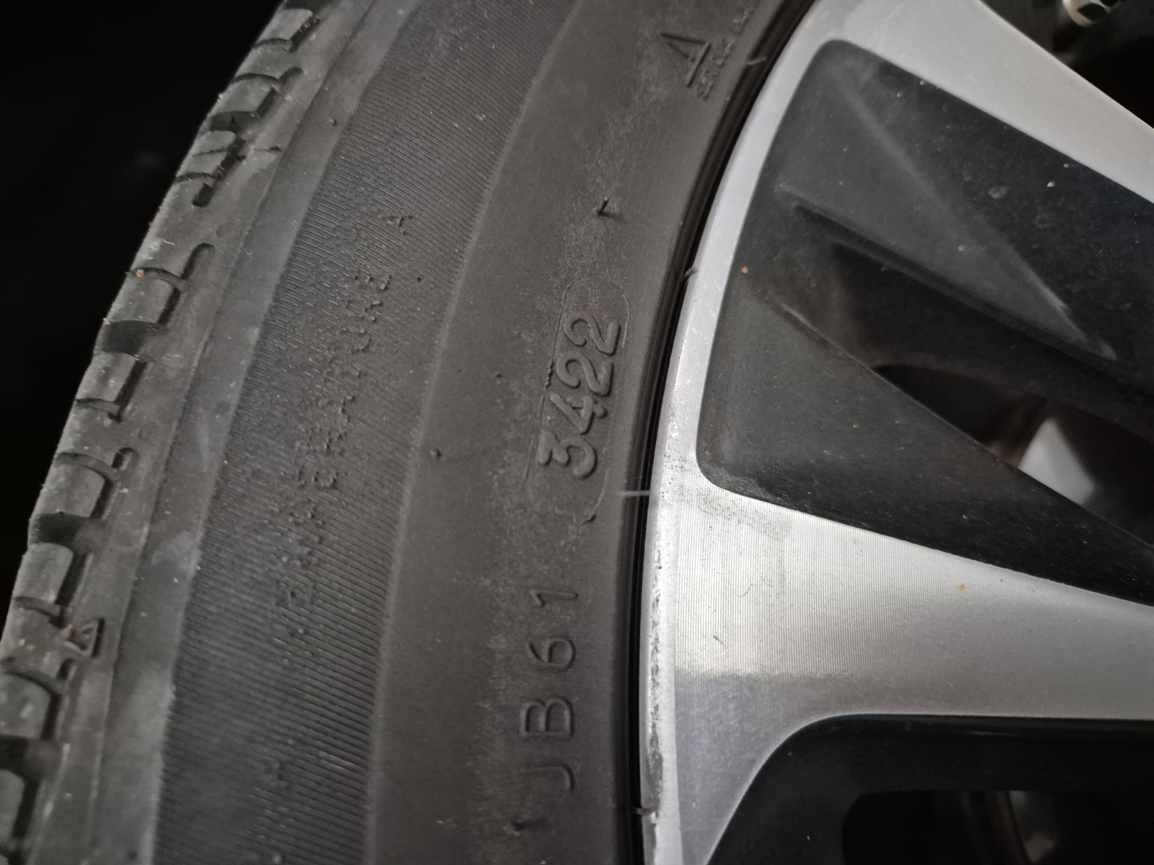 4자리 숫자를 찾으실 수 있어요. 제 타이어에서는 3422보이는데 이건 22년도 34번째주에 생산되었다는 표시랍니다.