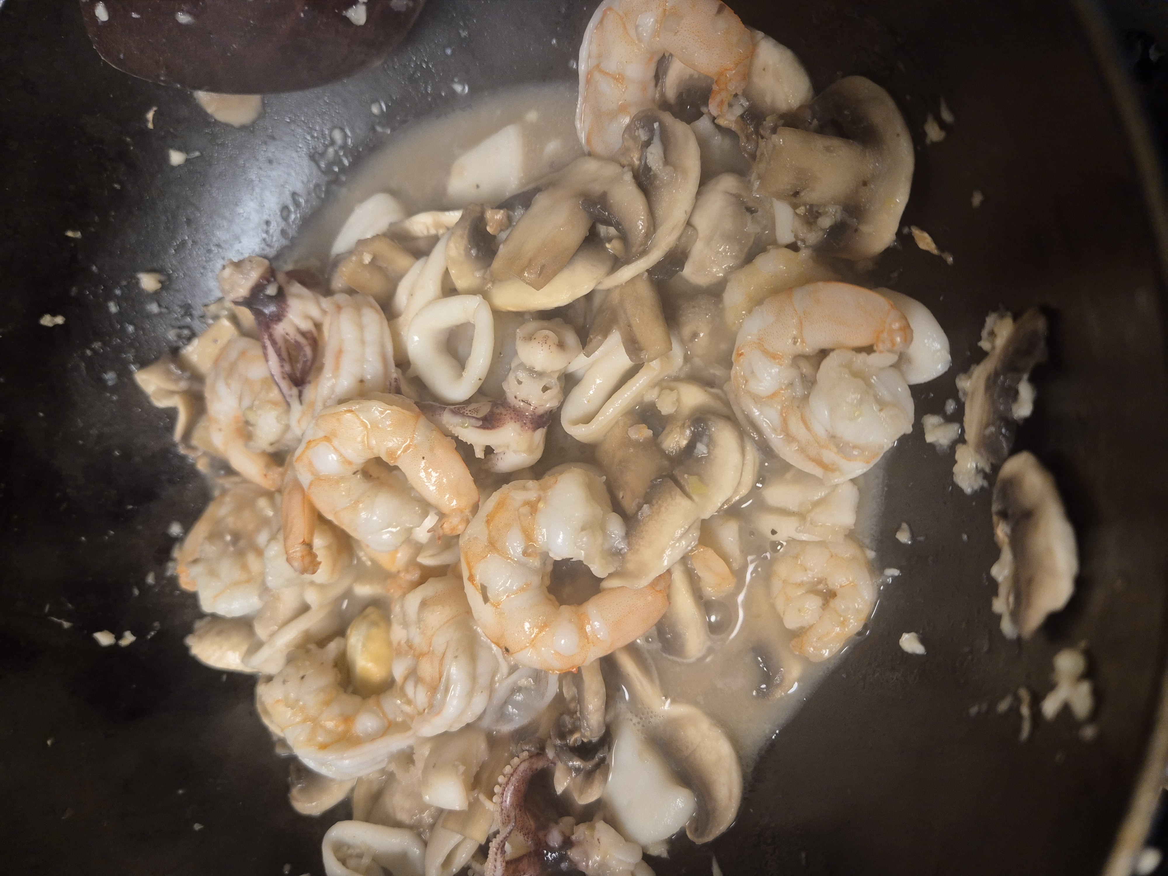 해산물 모듬 + 새우 한줌씩 넣어 볶습니다.
